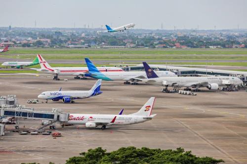 IDXChannel - Aktivitas pesawat tampak di landasan terbang Bandara Soekarno-Hatta, Kota Tangerang, Banten, Selasa (23/4/2024).