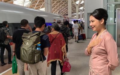 IDXChannel - Petugas Passenger Service on Station perempuan tampil dalam balutan kebaya di area stasiun dan kereta cepat Whoosh saat merayakan Hari Kartini di Stasiun Halim, Jakarta, Minggu (21/4/2024).
