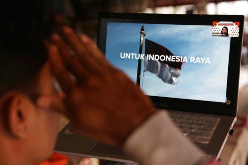 IDXChannel - Peserta upacara mengikuti Upacara Peringatan Hari Lahir Pancasila secara Virtual yang dihelat oleh Universitas 17 Agustus 1945 (Untag) Surabaya, Jawa Timur, Selasa (1/6/2021).