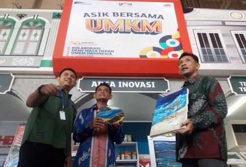 IDXChannel - Pemilik UMKM binaan Astra melalui Yayasan Dharma Bhakti Astra (YDBA) dan PT United Tractors Tbk, Recycle Academi, Surani (tengah), menunjukkan lukisan yang dibuatnya dari limbah styrofoam kepada Dept. Head Training & Mentoring YDBA Aloysius Daniel Harbianto (kiri) dan Pemilik UMKM binaan YDBA, PT Astana Wira Karya, Muhammad Umar Anif (kanan) dalam kegiatan #AsikBersamaUMKM YDBA di Pameran Gaikindo Indonesia International Auto Show (GIIAS), di ICE BSD, Tangerang, Banten, Jumat (18/8/2023).