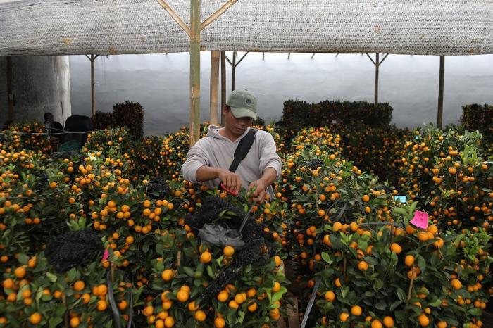 IDXChannel - Pekerja merawat pohon jeruk Kimkit dan Chusa yang dijual di kawasan Meruya, Jakarta, Selasa (3/2/2026).