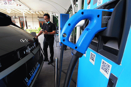 IDXChannel - Pengendara menggunakan SPKLU untuk mengisi listrik ke kendaraannya di SPKLU PLN UID Jakarta Raya, Jakarta, Kamis (6/10/2022).