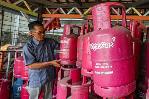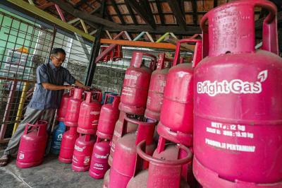 IDXChannel - Petugas merapikan tabung LPG nonsubsidi ukuran 12 kg di salah satu agen, Depok, Jawa Barat, Rabu (22/4/2026).