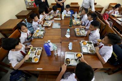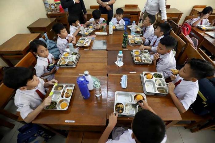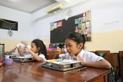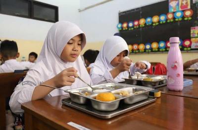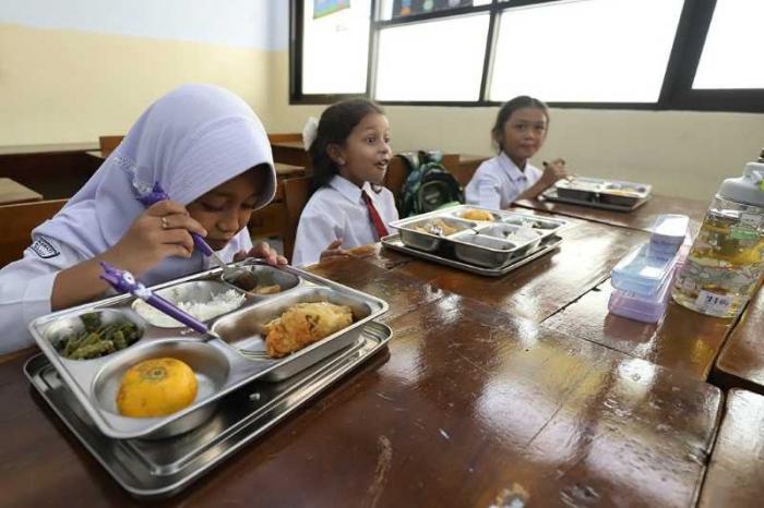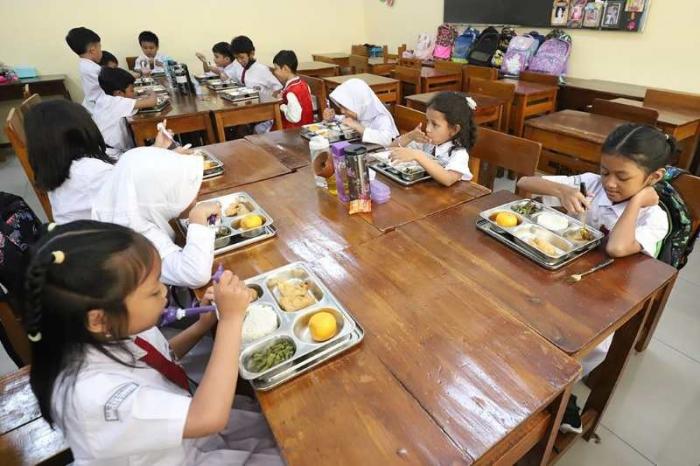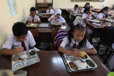 IDXChannel - Sejumlah murid menyantap makanan bergizi gratis di SD Barunawati, Palmerah, Jakarta Barat, Senin (6/1/2025).
