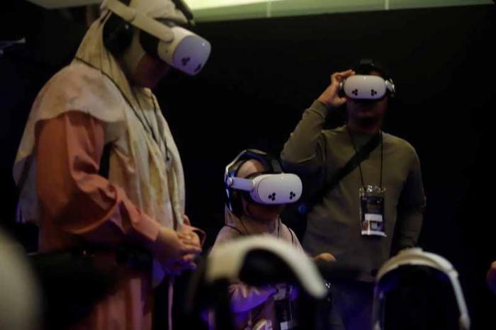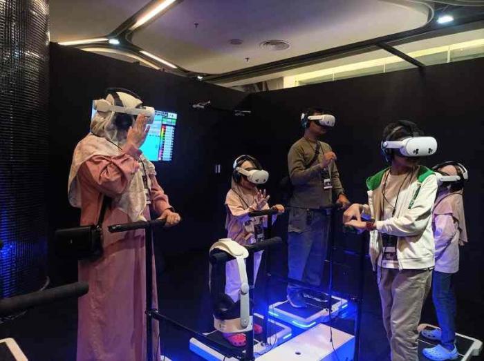 IDXChannel - Pengunjung menggunakan perangkat virtual reality (VR) saat simulasi manasik haji di arena Manasik Xperience, Kuningan City, Jakarta, Sabtu (8/3/2025).