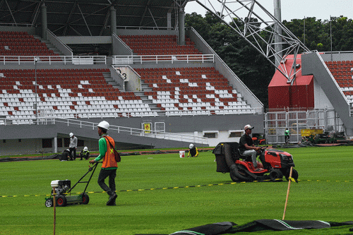Para pekerja terlihat berada di lingkungan stadion antara lain mengerjakan perawatan lapangan, penyelesaian pembuatan papan score, dan penyelesaian ruang ganti pemain.