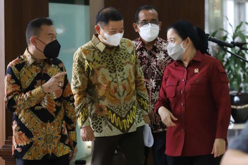 IDXChannel - Ketua DPR Puan Maharani didampingi Wakil Ketua DPR Sufmi Dasco Ahmad bersama Mensesneg Pratikno (kanan) dan Menteri PPN/Kepala Sappenas Suharso Monoarfa (kiri) memberikan keterangan pers terkait Surpres Presiden Joko Widodo di Lobby Nusantara III, Kompleks Parlemen MPR/DPR-DPD, Senayan, Jakarta, Rabu (29/9/2021).