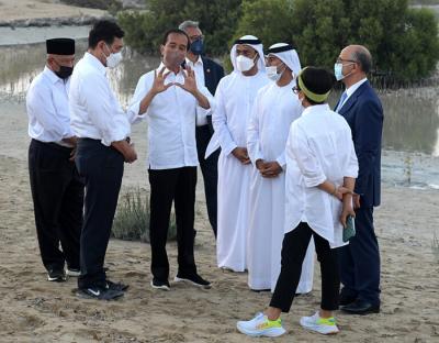 IDXChannel - Setelah bertemu dengan Putra Mahkota Abu Dhabi, Sheikh Mohammed bin Zayed Al Nahyan (MBZ) di Istana Al-Shatie, Presiden Joko Widodo meninjau Jubail Mangrove Park yang terletak di Pulau Al Jubail, Abu Dhabi, Persatuan Emirat Arab (PEA), pada Rabu sore, 3 November 2021.