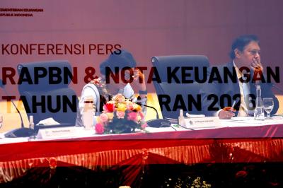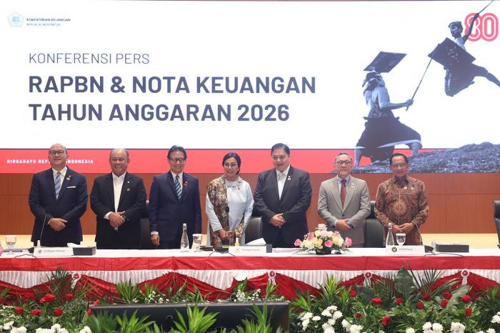 IDXChannel - Menteri Koordinator Bidang Perekonomian Airlangga Hartarto (tengah) bersama Menteri Keuangan Sri Mulyani (kiri) dan Menteri Koordinator Bidang Pangan Zulkifli Hasan (kanan) memberikan keterangan kepada wartawan terkait RAPB dan Nota Keuangan Tahun Anggaran 2026 di Jakarta, Jumat (15/8/2025).