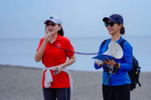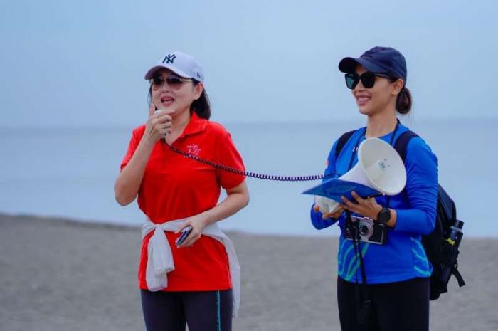 IDXChannel - Chief Risk dan Compliance Officer Prudential Indonesia Maria Rosalinda (kiri) didampingi Founder Langit Biru Pertiwi Nadya Mulya memberikan sambutan pada kegiatan Beach Clean-up di Pantai Tanjung Pasir, Tangerang, Banten, Minggu (14/12/2024).