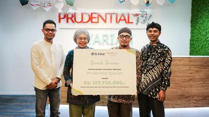 IDXChannel - (Kiri-kanan) Vice President, Head of Digital dan Ecosystem Partnership Prudential Syariah Harpedi Puseto, Chief Human Resources dan Community Investment Officer Prudential Syariah Indrijati Rahayoe, Direktur Eksekutif LazWaf Al-Azhar Mohammad Hasan, GM Fundraising dan Partnership LazWaf Al-Azhar Rahmatullah Sidik, berfoto bersama saat serah trima donasi program "Kurban Bersama, Berkah Sesama", di Jakarta, Selasa (18/6/2024).