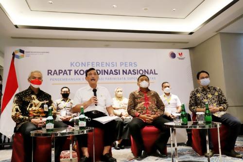 IDXChannel - Menteri Koordinator bidang Kemaritiman dan Investasi, Luhut Binsar Pandjaitan (kedua kiri), Wakil Menteri Perdagangan Indonesia Jerry Sambuaga (kanan) Gubernur Sulut Olly Dondokambey (kedua kanan) dan Gubernur Jawa Tengah Ganjar Pranowo saat konferensi pers usai menggelar Rapat Koordinasi Nasional Pengembangan Lima Destinasi Pariwisata Super Prioritas (Rakornas Lima DPSP), Jakarta, Rabu (1/12/2021).