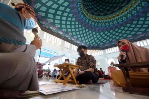 IDXChannel - Dua mualaf mengikuti proses masuk Islam dengan mengucapkan dua kalimat syahadat usai pelaksanaan Shalat Jumat di Masjid Al-Akbar Surabaya, Jawa Timur, Jumat (16/4/2021).