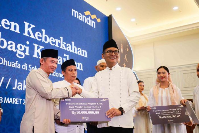 IDXChannel - Direktur Commercial Banking Bank Mandiri Totok Priyambodo bersama Komisaris Utama Bank Mandiri Zulkifli Zaini, Komisaris Independen Bank Mandiri Mia Amiati, SEVP Corporate Banking 1 Bank Mandiri Eny Kurniasih Mukarromah, serta Regional CEO Bank Mandiri Region V/Jakarta 3 Midian Samosir menyerahkan santunan Ramadan kepada perwakilan penerima manfaat di Jakarta, Selasa (3/3/2026).