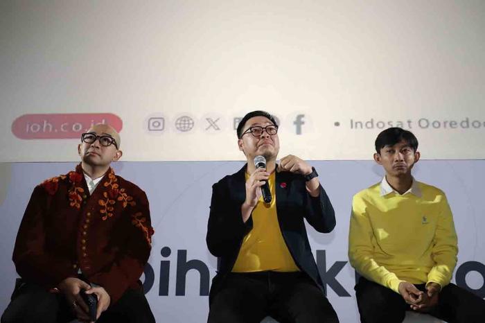 (Dari kiri kekanan) Creative Duo Personalities Dave Hendrik, Iwet Ramadhan, SVP-Head of Corporate Communications Indosat Ovidia Nomia, SVP-Head of Network Operations Indosat Raden Tofan dan Stand-up Comedian Yono Bakrie berfoto bersama saat Peluncuran #LebihBaikIndosat di Jakarta, Jumat (20/2/2026).
