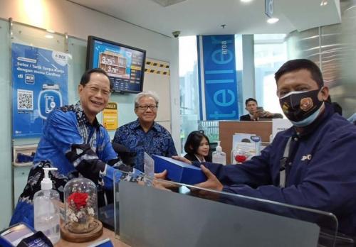 IDXCannel - Presiden Direktur BCA Jahja Setiaatmadja disaksikan oleh Kepala BCA Kantor Wilayah VIII Gunawan Prayogo menyerahkan cenderamata kepada nasabah di BCA KCU City Tower, Jakarta, Senin (4/9/2023).
