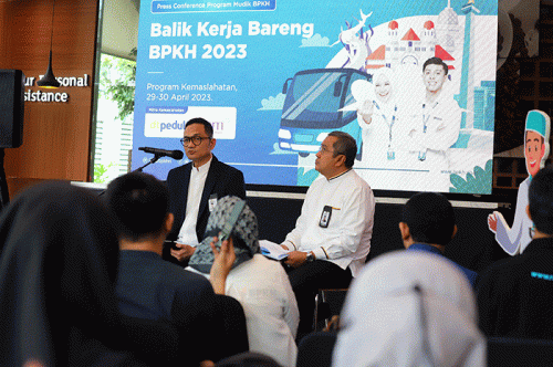 IDXChannel - Kepala BPKH Fadlul Imansyah (kiri) bersama Anggota BPKH Amri Yusuf (kanan) saat konferensi pers program Balik Kerja Bareng BPKH 2023 di Muamalat Tower, Jakarta Selatan, Senin (10/4/2023).
