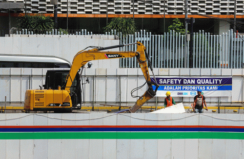 IDXChannel - Pekerja beraktivitas di proyek revitalisasi Halte Transjakarta Sarinah, Jakarta Pusat, Rabu (11/5/2022).