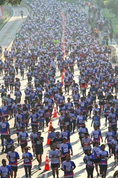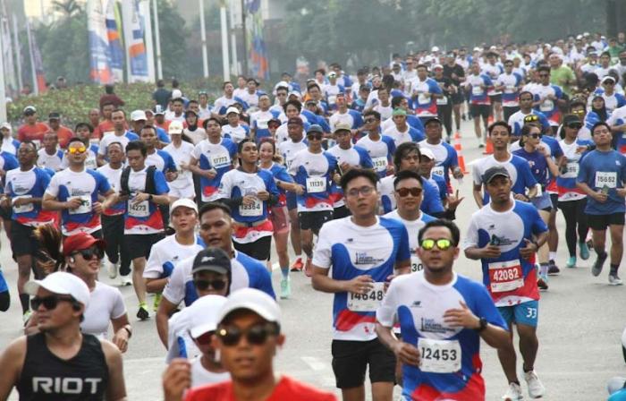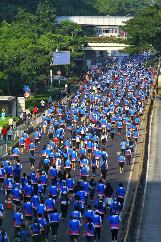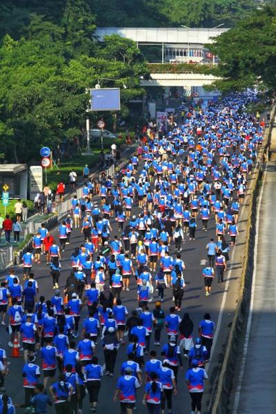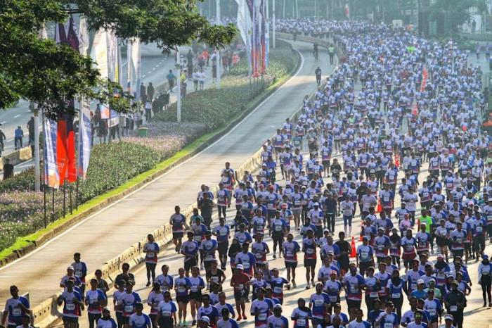 JAKARTA - Ribuan pelari memenuhi kawasan Sudirman - Thamrin dalam gelaran BTN Jakarta International Marathon (JAKIM) 2024 di Jakarta, Minggu (23/6/2024). BTN JAKIM 2024 sukses digelar dengan diikuti lebih dari 15.000 pelari baik dari dalam negeri maupun manca negara. Ada sekitar 232 pelari asing dari 32 negara yang turut serta dalam ajang yang digelar untuk memeriahkan HUT Jakarta yang ke 497 tersebut.