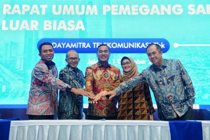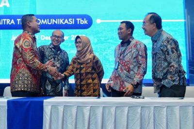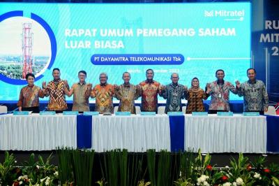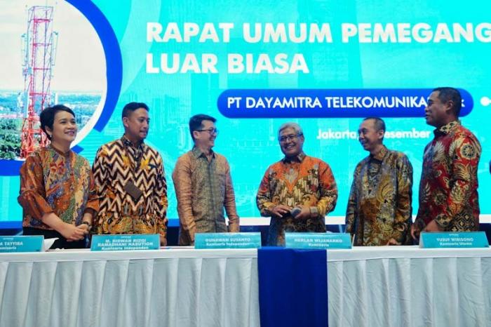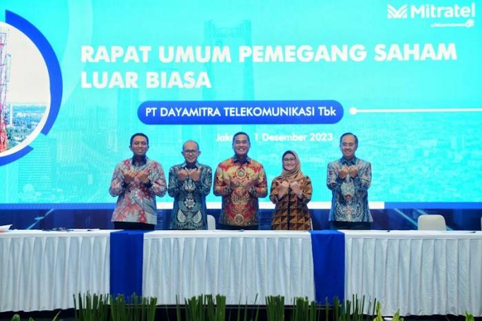 JAKARTA - Jajaran Komisaris dan Direksi (kiri-kanan) Komisaris Mira Tayyiba, Komisaris Independen M. Ridwan Rizqi Ramadhani Nasution, Komisaris Independen Gunawan Susanto, Komisari Herlan Wijanarko, Komisaris Utama Yusuf Wibisono dan Direktur Utama Theodorus Ardi Hartoko berbincang di sela acara Rapat Umum Pemegang Saham Luar Biasa (RUPSLB) PT Dayamitra Telekomunikasi Tbk (Mitratel) di Jakarta, Jumat (1/12/2023).