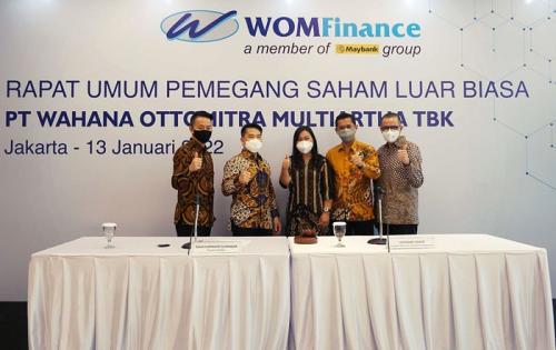 IDXChannel - (kiri kekanan) Direktur PT Wahana Ottomitra Multiartha Tbk, Njauw Vido Onadi, Presiden Direktur PT Wahana Ottomitra Multiartha Tbk, Djaja Suryanto Sutandar, Direktur PT Wahana Ottomitra Multiartha Tbk, Cincin Lisa Hadi, Direktur PT Wahana Ottomitra Multiartha Tbk, Wibowo dan Direktur PT Wahana Ottomitra Multiartha Tbk, Anthony Y. Panggabean berfoto bersama saat acara Rapat Umum Pemegang Saham Luar Biasa di Jakarta, Kamis (13/1/2022).