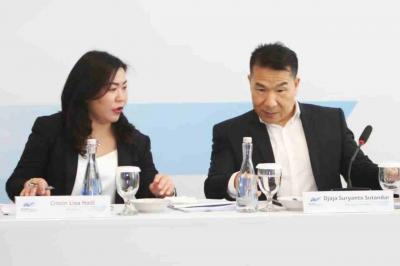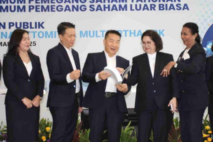 IDXChannel - Presiden Direktur WOM Finance Djaja Suryanto Sutandar (tengah) berbincang dengan (kiri-kanan) Direktur Cincin Lisa Hadi, Wakil Presiden Direktur Njauw Vido Onadi, Presiden Komisaris Sarastri Baskoro dan Komisaris Thilagavaty Nadason usai Rapat Pemegang Saham (RUPS) Tahunan dan RUPS Luar Biasa di Jakarta, Selasa (25/3/2025).