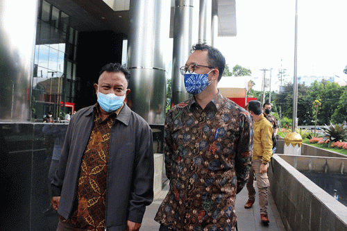 IDXChannel - Komisioner Pemantauan Penyelidikan Komnas HAM Choirul Anam (kiri) bersama Komisioner Pendidikan dan Penyuluhan Komnas HAM Beka Ulung Hapsara memberikan keterangan pers usai bertemu Bupati Langkat di gedung Merah Putih KPK, Jakarta, Senin (7/2/2022).