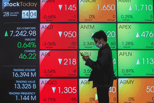 IDXChannel - Layar menampilkan pergerakan Indeks Harga Saham Gabungan (IHSG) di gedung Bursa Efek Indonesia, Jakarta Selatan, Kamis (28/4/2022).