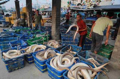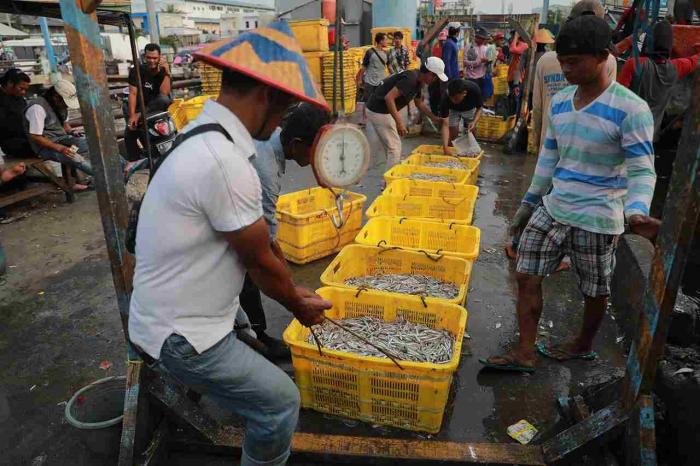 IDXChannel - Pekerja beraktivita bongkar muat ikan di Pelabuhan Muara Angke, Jakarta Utara, Senin (5/5/2025).