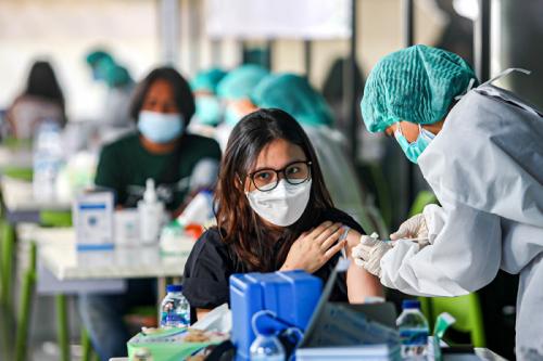 IDXChannel - Petugas saat memberikan suntikan vaksin Covid-19 jenis Sinovac untuk warga di Sentra Vaksinasi MNC Center, Kebon Sirih, Jakarta Pusat, Minggu (25/7/2021).