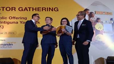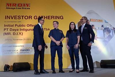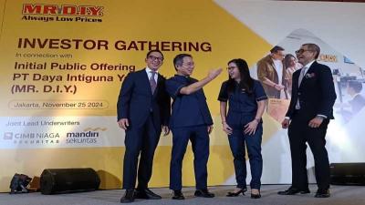 IDXChannel - President Director PT Mandiri Sekuritas Oki Ramadhana, President Director PT Daya Intiguna Yasa Tbk (MR. D.I.Y.) Edwin Cheah, Director PT Daya Intiguna Yasa Tbk (MR. D.I.Y.) Rika Juniaty Tanzil, dan President Director PT CIMB Niaga Sekuritas Harry Supoyo berbincang Bersama saat acara Investor Gathering dalam rangka Initial Public Offering (IPO) MR. D.I.Y, di Jakarta, Senin (25/11/2024).