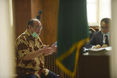 IDXChannel - Suasana sidang Gugatan antara Perhimpunan Pemilik dan Penghuni Satuan Rumah Susun (P3SRS) Apartment Mangga Dua Court dengan bekas pengembang PT Duta Pertiwi Tbk/Sinarmas di Pengadilan Negeri Jakarta Utara, Senin (18/10/2021).