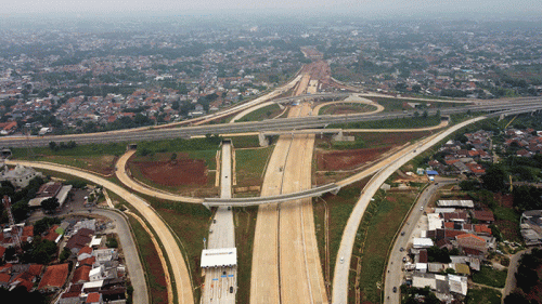IDXChannel - Foto udara pembangunan tol di kawasan simpang susun krukut di Limo, Depok, Jawa Barat, Selasa (31/1/2023).