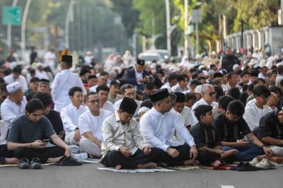 Saf salat jemaah meluas hingga menutup ruas Jalan Menteng Raya saat pelaksanaan Salat Idulfitri di lingkungan PP Muhammadiyah.