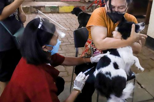 IDXChannel - Paramedis dari pusat kesehatan hewan (Puskeswan) Suku Dinas Ketahanan Pangan, Kelautan dan Pertanian, Kota Jakarta Selatan Selatan menyuntikkan vaksin anti rabies kepada hewan piaraan secara gratis di Petukangan Selatan, Jakarta, Rabu (15/9/2021).