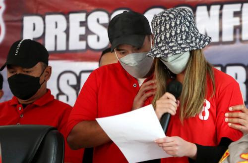 IDXChannel - Artis Nia Ramadhani dan suaminya Ardi Bakrie saat menyampaikan permintaan maaf dihadapan awak media pada rilis kasus narkoba yang menjeratnya di Polres Metro Jakarta Pusat, Sabtu (10/7/2021).