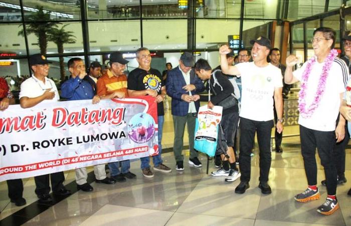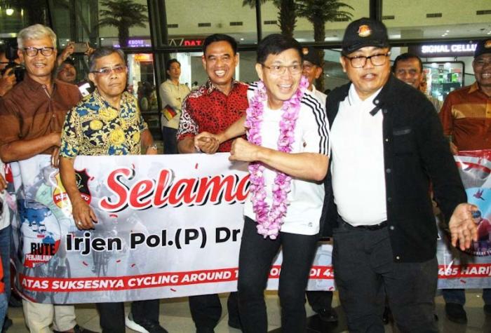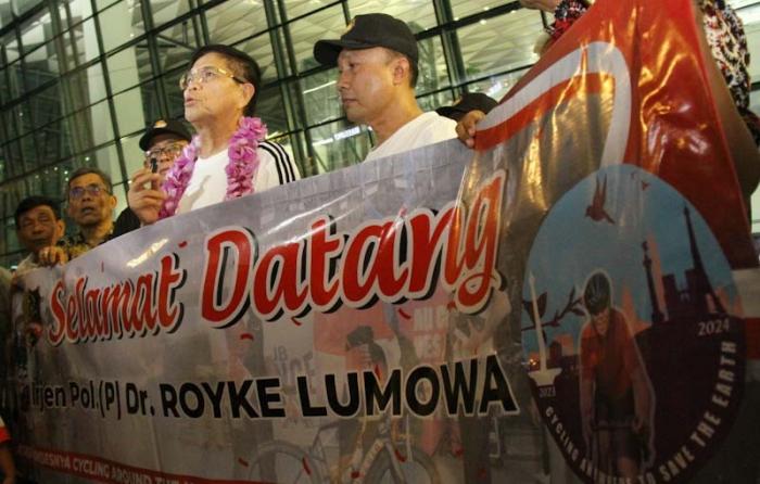 IDXChannel - Irjen Pol (Purn) Royke Lumowa tiba di Terminal 3 Bandara Soekarno Hatta, Kota Tangerang, Banten, usai melakukan aksi bersepeda ke Paris, Prancis, Jumat (9/8/2024).