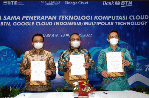 IDXChannel - Direktur IT & Digital PT Bank Tabungan Negara (Persero) Tbk. Andi Nirwoto (tengah) bersama Country Sales Director Google Cloud Indonesia Anang Efendy (kiri) dan Director Account Management FSI & Commercial PT Multipolar Technology, Tbk. Herryyanto (kanan) menunjukkan naskah Perjanjian Kerja Sama Penerapan Teknologi Komputasi Cloud di Jakarta, Selasa (23/8/2022).