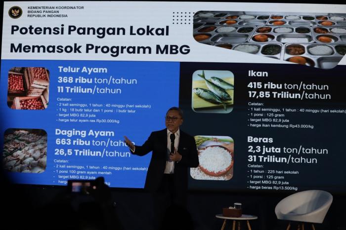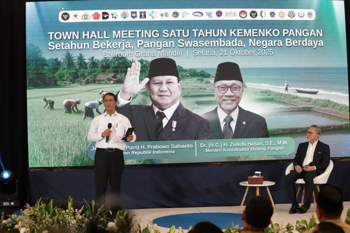 IDXChannel - Menteri Koordinator Bidang Pangan Zulkifli Hasan (Zulhas) memberikan pemaparan saat kegiatan Town Hall Meeting Satu Tahun Kemenko Pangan di Gedung Graha Mandiri, Jakarta, Selasa (21/10/2025).