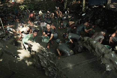 IDXChannel - Ratusan warga dari anak-anak, remaja hingga orang tua ramai-ramai menguras Sendang Gede di wilayah RW VIII, Desa Pucung, Kelurahan Pudakpayung, Kecamatan Banyumanik, Semarang, Jawa Tengah, Jumat (1/4/2022).