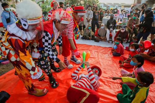 IDXChannel - Sejumlah Badut yang tergabung dalam komunitas Aku Badut Indonesia (ABI) menghibur anak-anak korban kebakaran di pengungsian kawasan Kemang Utara IX, Jakarta, Rabu (18/8/2021).