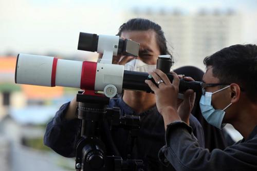 IDXChannel - Dosen dan mahasiswa Prodi Hukum Keluarga Islam Universitas Muhammadiyah Surabaya (UMSurabaya) melakukan pengamatan gerhana bulan total menggunakan bantuan teleskop di Rooftop Gedung At-Tauhid Tower lantai 4, UMSurabaya, Jawa Timur, Rabu (26/5/2021).