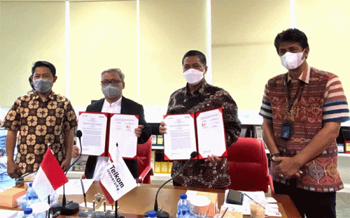 IDXChannel - Direktur Consumer Bank BTN Hirwandi Gafar bersama Rektor Telkom University Adiwijaya didampingi Kepala Kantor Wilayah 1 Bank BTN Edward Alimin Syarif dan Direktur Keuangan Telkom University Nurwijayadi memperlihatkan naskah kerjasama Nota Kesepahaman tentang Tridarma Perguruan Tinggi dan Pengembangan Sumber Daya Institusi Serta Penyediaan Fasilitas Pelayanan dan Jasa Perbankan Berdasarkan Prinsip Syariah dengan Telkom University di Bandung, Jawa Barat, Jumat (27/5/2022).