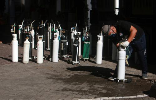 IDXChannel - Sejumlah warga mengantre dengan penerapan protokol kesehatan ketat untuk mengisi tabung oksigen yang diberikan secara gratis di Halaman Balai Kota Semarang, Jawa Tengah, Jumat (6/8/2021).