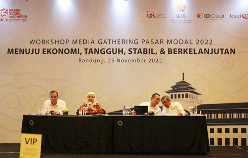IDXChannel - (Dari Kiri ke Kanan) Direktur Utama Bursa Efek Indonesia Iman Rachman, Deputi Komisioner Pengawas Pasar Modal I Otoritas Jasa Keuangan Djustini Septiana, Direktur Utama Kliring Penjaminan Efek Indonesia Iding Pardi Dan Direktur Utama Kustodian Sentral Efek Indonesia Uriep Budhi Prasetyo saat menjadi pembicara dalam Workshop Media Gathering Pasar Modal 2022, Menuju Ekonomi Tangguh Stabil Dan Berkelanjutan di Bandung, Jawa Barat, Jumat (25/11/2022).