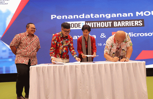 IDXChannel - (Dari Kiri ke Kanan) Country Lead Azure GTM & Code Without Barries Lead Microsoft Indonesia, Fiki Setiyono, CFO & Diversity/Inclusion Lead Microsoft Indonesia, Krishna Worotikan, Director and Chief Strategic Transformation & IT Officer PT XL Axiata Tbk. Yessie D Yosetya, dan Chief Human Capital Officer PT XL Axiata Tbk. M. Hira Kurnia saat melakukan penandatanganan kerja sama di Jakarta, Kamis (18/8/2022).