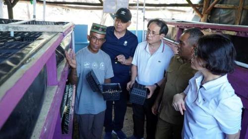 IDXChannel - UMKM Kepiting Binaan Astra melalui Yayasan Dharma Bhakti Astra melalui Yayasan Dharma Bhakti Astra (YDBA) di Desa Golo Sepang, Manggarai Barat, NTT, Vinsensius Saur (kiri) menjelaskan sistem budidaya kepiting crab box yang dijalankannya kepada Bupati Manggarai Barat Edistasius Endi (kedua kanan), Ketua Pengawas YDBA Lina Djafar (kanan), Ketua Pengurus YDBA Sigit P. Kumala (tengah), dan Advisor YDBA Tonny Sumartono (kedua kiri), di Manggarai Barat, NTT.