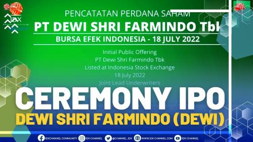 IDX CHANNEL- PT Dewi Shri Farmindo Tbk akan melaksanakan penawaran umum perdana saham atau Initial Public Offering (IPO) di Bursa Efek Indonesia (BEI) hari ini, Senin (18/7/2022). Calon emiten dengan kode saham DEWI ini akan menjadi perusahaan tercatat ke-26 di BEI pada tahun 2022.
