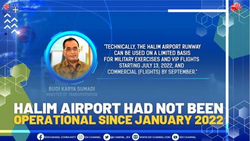 IDX CHANNEL- Minister Transportation Budi Karya Sumadi said Halim Perdanakusuma Airport will reopen flight services in September 2022. The minister has also tested the runway as a result of the revitalization of Halim Perdana Kusuma Airport, Jakarta, Tuesday (12/7/2022).