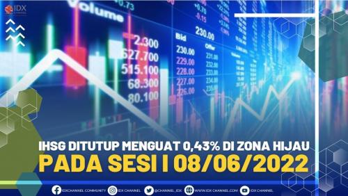 IHSG DITUTUP MENGUAT 0,43% DI ZONA HIJAU PADA SESI I 08/06/2022.(SUMBER : IDX CHANNEL)